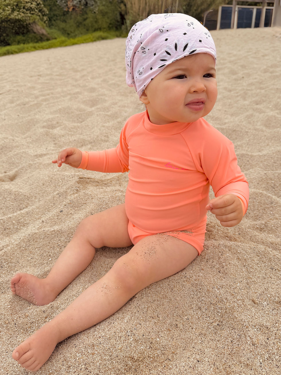 On the agenda: beach, sun, and your baby's first swims! But be careful, this kind of heavenly program requires planning! You've probably already packed all the essentials for a day at the beach or pool: sunscreen, hat, umbrella, and sunglasses... But have you ever heard of our UV-protective swimsuits? Your baby's skin is still immature and contains very little melanin to protect it from the sun's UV rays. With this in mind, our design teams have created a range of UV-protective swimsuits tailored to the needs of little ones from 6 months to 36 months. Our baby collection is ethical, cheerful, modern, and sunny, and, above all, guarantees optimal sun protection. The choice of our materials has been carefully considered, and we are committed to using high-quality materials. To achieve this, the designers at Baïnes use an Italian fabric made from 78% recycled fibers to make our products. Certified UPF50+, our products are tested by independent laboratories to block 98% of UVA and UVB rays, compared to 10% for conventional clothing. As we strive to always go further in our eco-responsible approach, our products are also Oeko-Tex Standard 100 certified. This certification indicates that our products are reliably tested for harmful substances and guarantees that our products are safe for your health. Choosing a Baïnes UV-protective swimsuit means choosing your newborn's safety. Combining innovative design and comfort for little ones, Baïnes stands out for its unique approach. You'll find our unisex baby "Mango" UV-protective bodysuit, which is both trendy and timeless, embellished with embroidery on the heart for a sharp look and delicate snaps on the back and crotch for easy dressing. Also discover our "Kiwi" swim shorts, featuring a soft mesh interior and also designed to easily accommodate a baby's diaper. Finally, we also offer UV-protective tops for infants that are easy to dress up thanks to the chest zip or special collars. Baïnes is a brand of choice for parents concerned about the health and well-being of their children, the environment, and fashion. So, are you convinced?